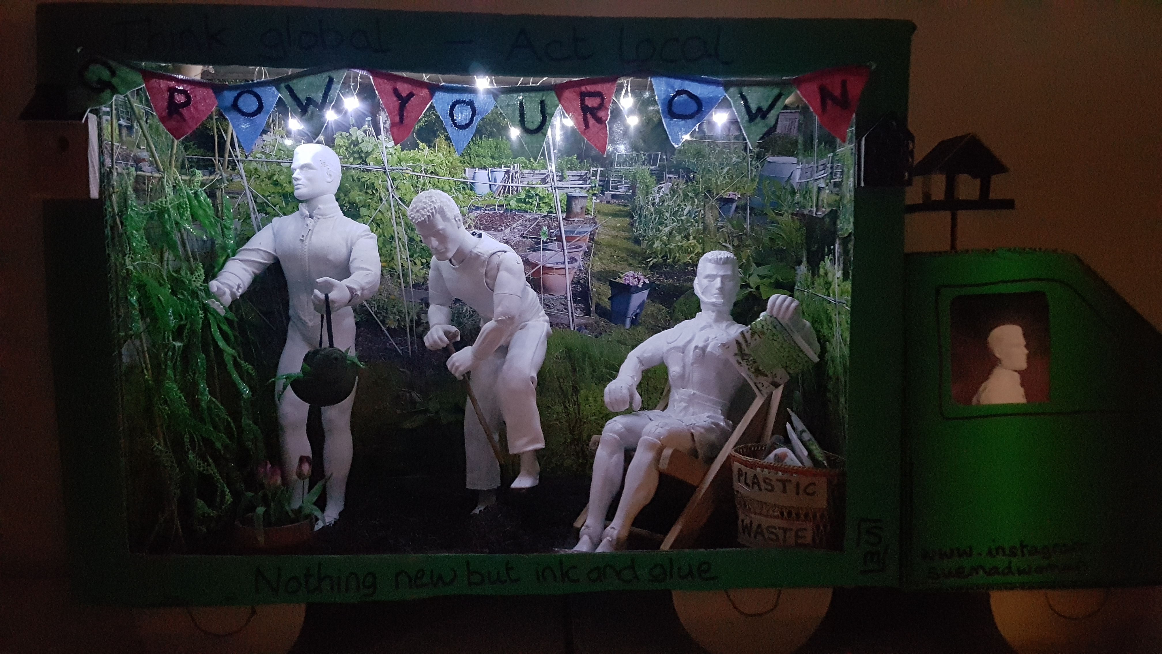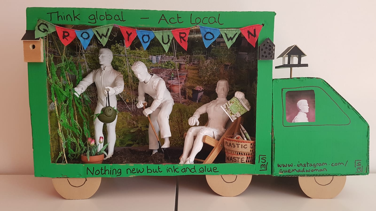 Left – Grow Your Own 2020 (for Kendal virtual Torchlight Festival, ‘Think Global – Act Local’ http://youtube.com/watch?v=pAH86Kbiwxo) Right – Making Masks 2021